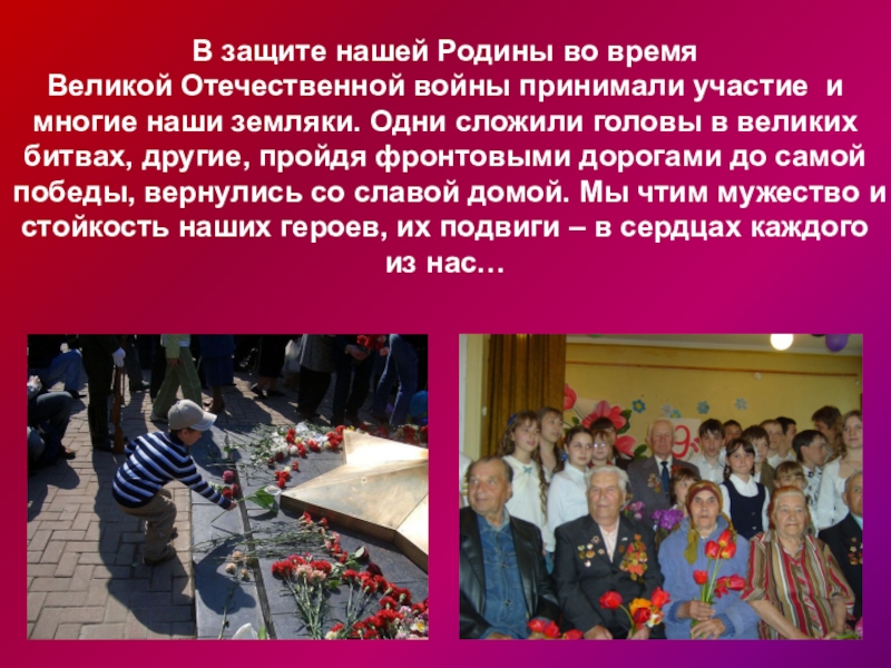 многие наши земляки. Одни сложили головы в великих битвах, другие, пройдя фронтовыми дорогами до самой победы, вернулись со славой домой. Мы чтим мужество и стойкость наших героев, их подвиги – в сердцах каждого из нас…
