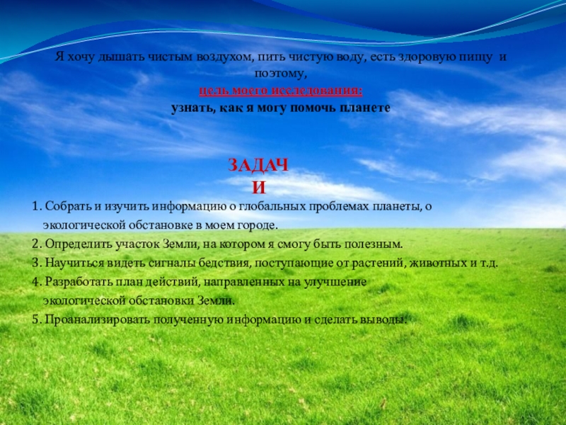Я хочу дышать чистым воздухом, пить чистую воду, есть здоровую пищу и поэтому,