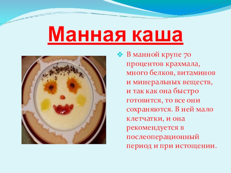 В манной крупе 70 процентов крахмала, много белков, витаминов и