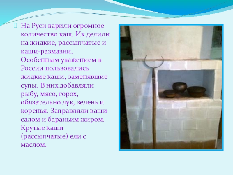 Слайд 11На Руси варили огромное количество каш. Их делили на жидкие, рассыпчатые