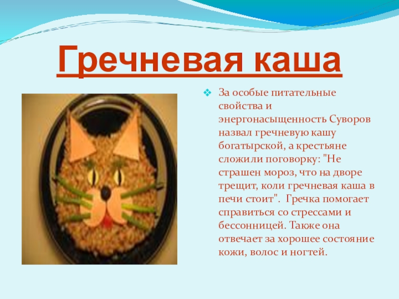 богатырской, а крестьяне сложили поговорку: "Не страшен мороз, что на дворе трещит, коли гречневая каша в печи стоит". Гречка помогает справиться со стрессами и бессонницей. Также она отвечает за хорошее состояние кожи, волос и ногтей.
