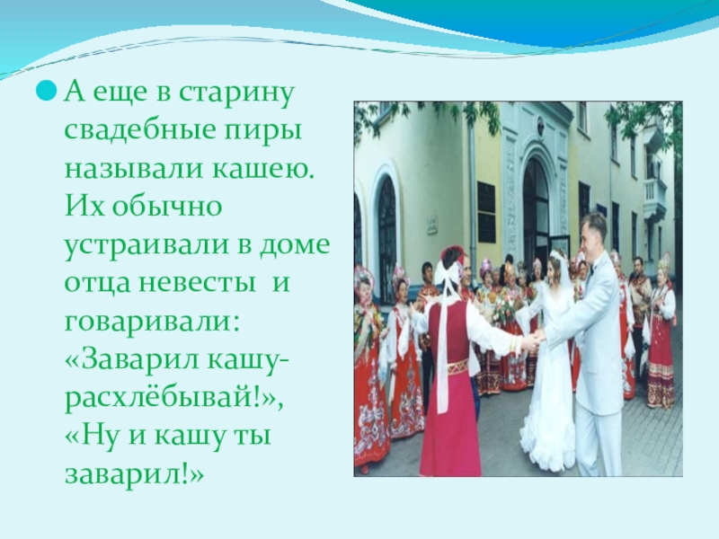 А еще в старину свадебные пиры называли кашею. Их обычно устраивали