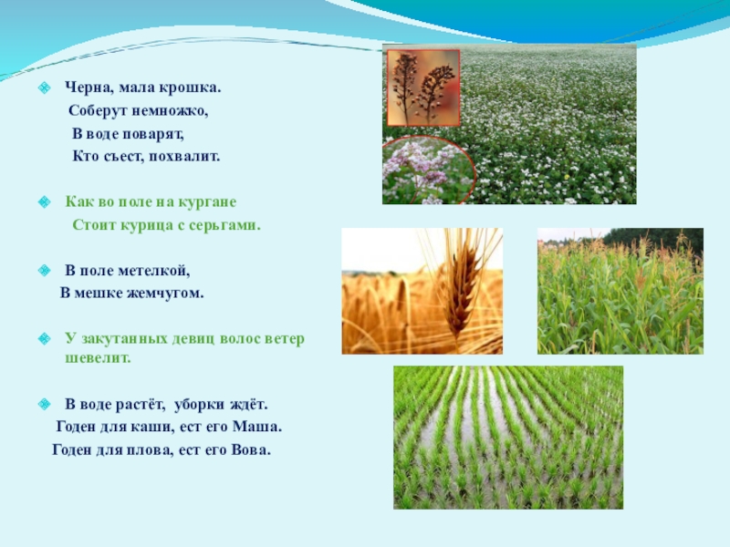 Из какой зерновой культуры приготовлена манная крупа? (из пшеницы – 9ч., не знаю – 4ч.)