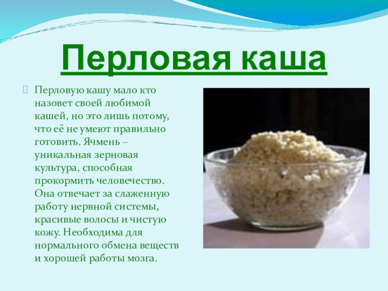 лишь потому, что её не умеют правильно готовить. Ячмень – уникальная зерновая культура, способная прокормить человечество. Она отвечает за слаженную работу нервной системы, красивые волосы и чистую кожу. Необходима для нормального обмена веществ и хорошей работы мозга.