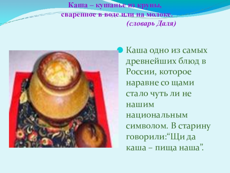 Каша одно из самых древнейших блюд в России, которое наравне со щами стало чуть ли не нашим национальным символом. В старину говорили:“Щи да каша – пища наша”.