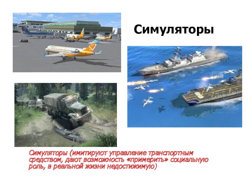 Симуляторы (имитируют управление транспортным средством, дают возможность «примерить» социальную роль, в