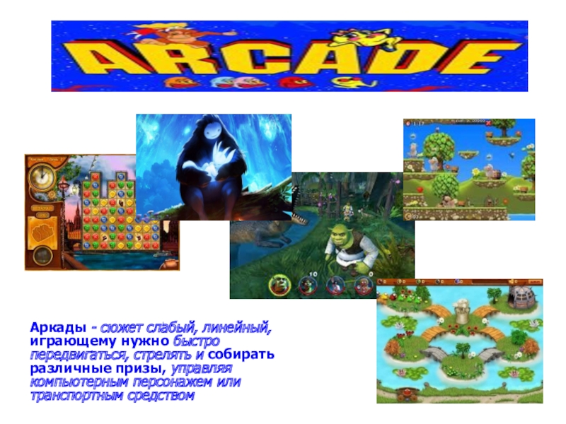 Слайд 11Аркады - сюжет слабый, линейный, играющему нужно быстро передвигаться, стрелять и