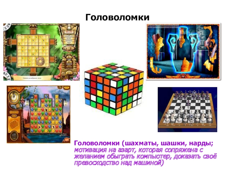 Слайд 12Головоломки (шахматы, шашки, нарды; мотивация на азарт, которая сопряжена с желанием