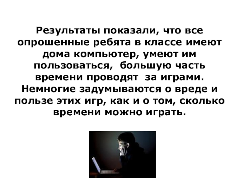 Слайд 29Результаты показали, что все опрошенные ребята в классе имеют дома компьютер,