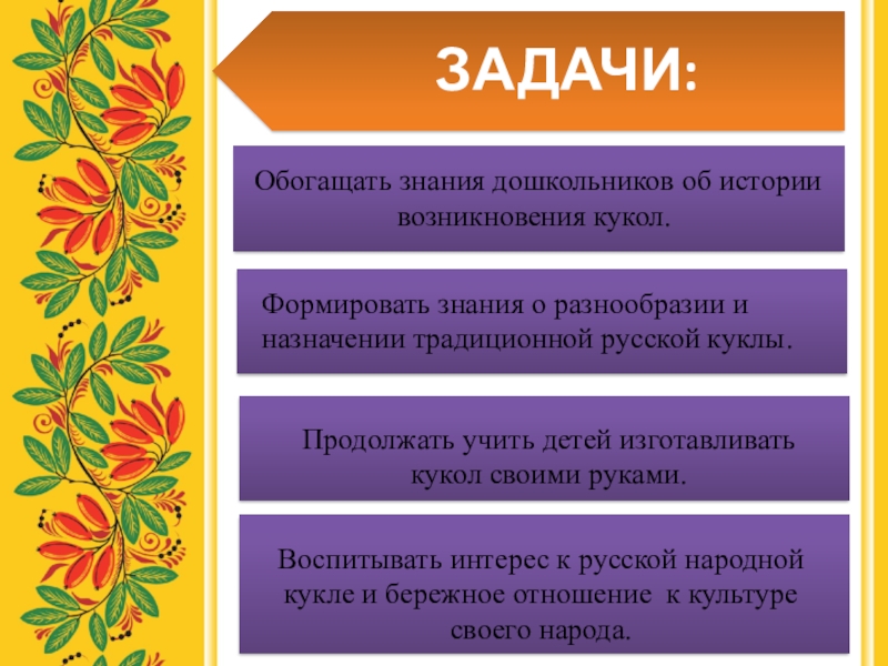 Воспитывать интерес к русской народной кукле и бережное отношение к культуре своего народа.