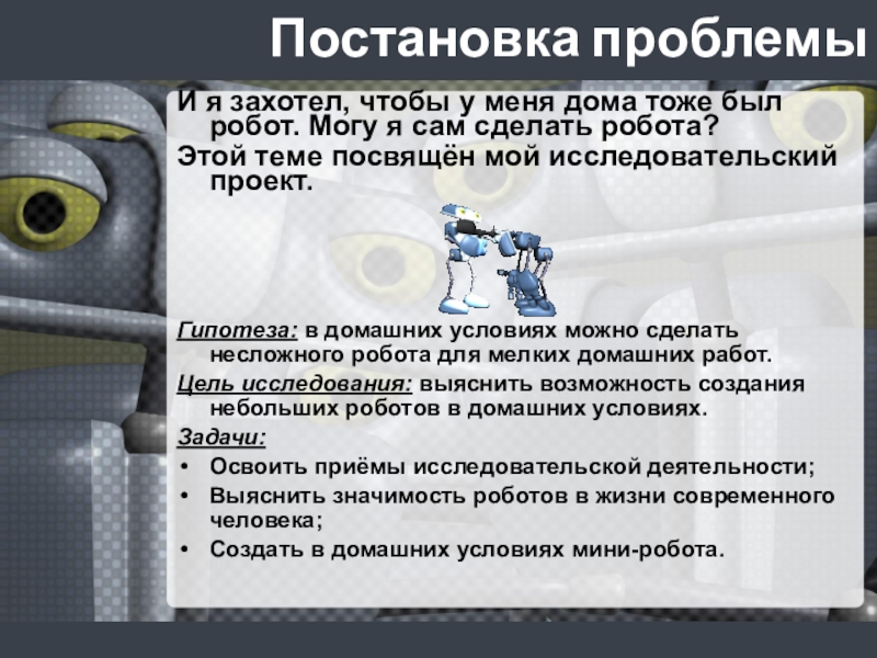 Цель исследования: выяснить возможность создания небольших роботов в домашних условиях.