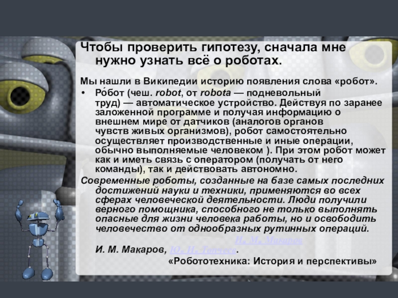 Слайд 8Чтобы проверить гипотезу, сначала мне нужно узнать всё о роботах.