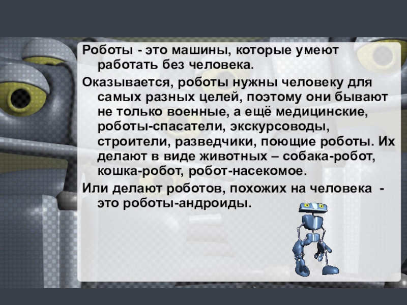 Слайд 9Роботы - это машины, которые умеют работать без человека.