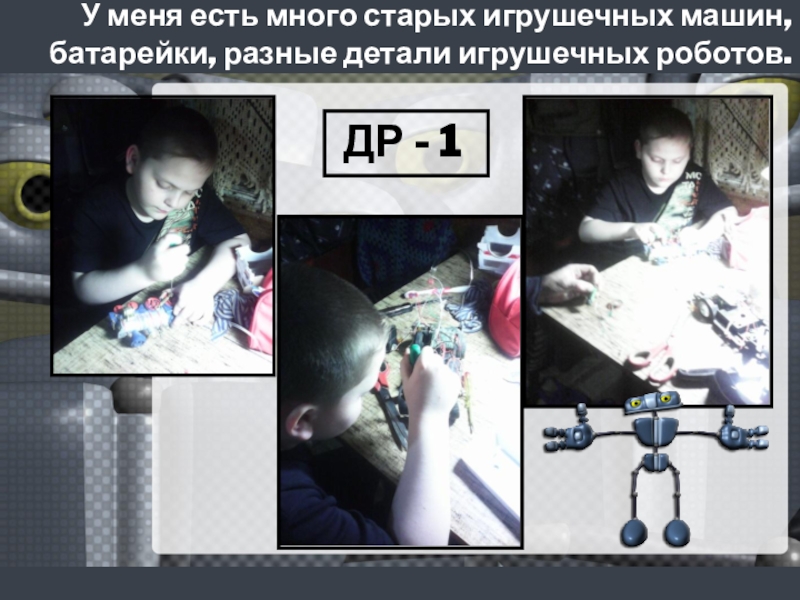 Слайд 15У меня есть много старых игрушечных машин, батарейки, разные детали игрушечных