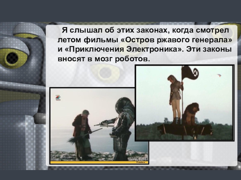 фильмы «Остров ржавого генерала» и «Приключения Электроника». Эти законы вносят в мозг роботов.