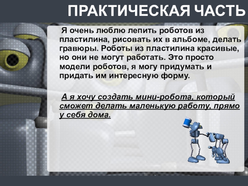 рисовать их в альбоме, делать гравюры. Роботы из пластилина красивые, но они не могут работать. Это просто модели роботов, я могу придумать и придать им интересную форму.
