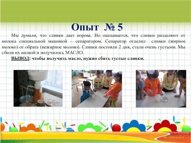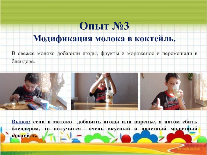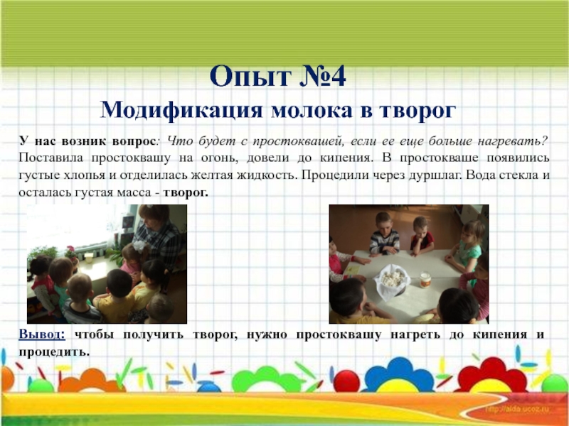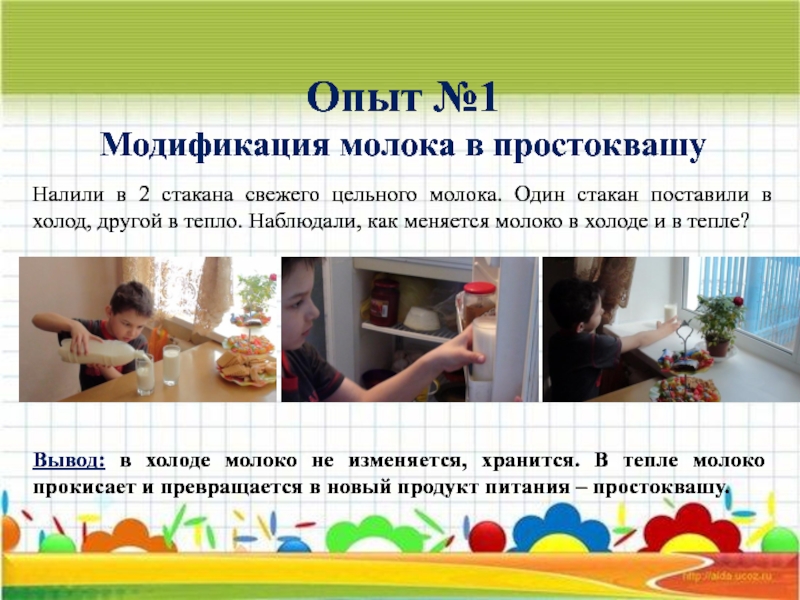 Вывод: в холоде молоко не изменяется, хранится. В тепле молоко прокисает и превращается в новый продукт питания – простоквашу.