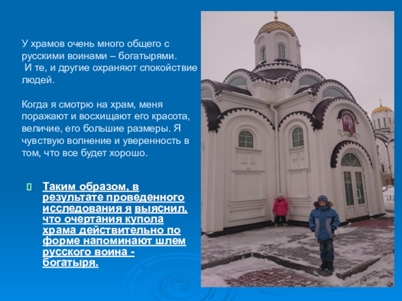 Таким образом, в результате проведенного исследования я выяснил, что очертания купола храма действительно по форме напоминают шлем русского воина -богатыря.