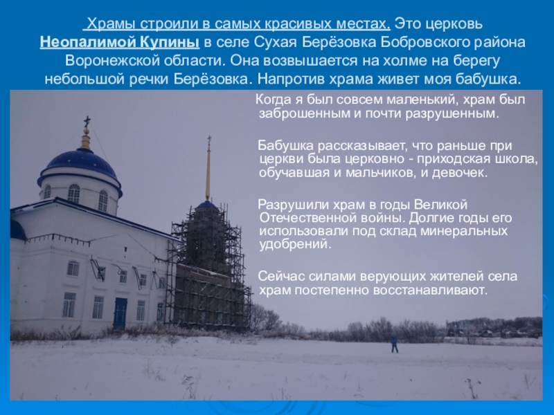 Бабушка рассказывает, что раньше при церкви была церковно - приходская школа, обучавшая и мальчиков, и девочек.