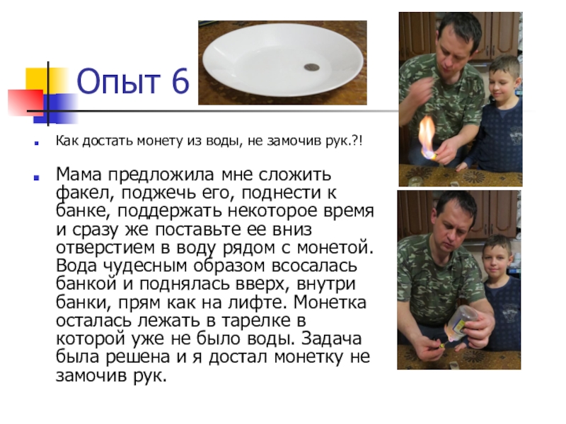 сложить факел, поджечь его, поднести к банке, поддержать некоторое время и сразу же поставьте ее вниз отверстием в воду рядом с монетой. Вода чудесным образом всосалась банкой и поднялась вверх, внутри банки, прям как на лифте. Монетка осталась лежать в тарелке в которой уже не было воды. Задача была решена и я достал монетку не замочив рук.