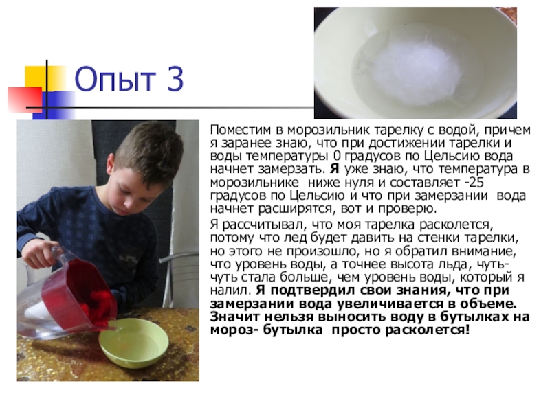 что при достижении тарелки и воды температуры 0 градусов по Цельсию вода начнет замерзать. Я уже знаю, что температура в морозильнике ниже нуля и составляет -25 градусов по Цельсию и что при замерзании вода начнет расширятся, вот и проверю.