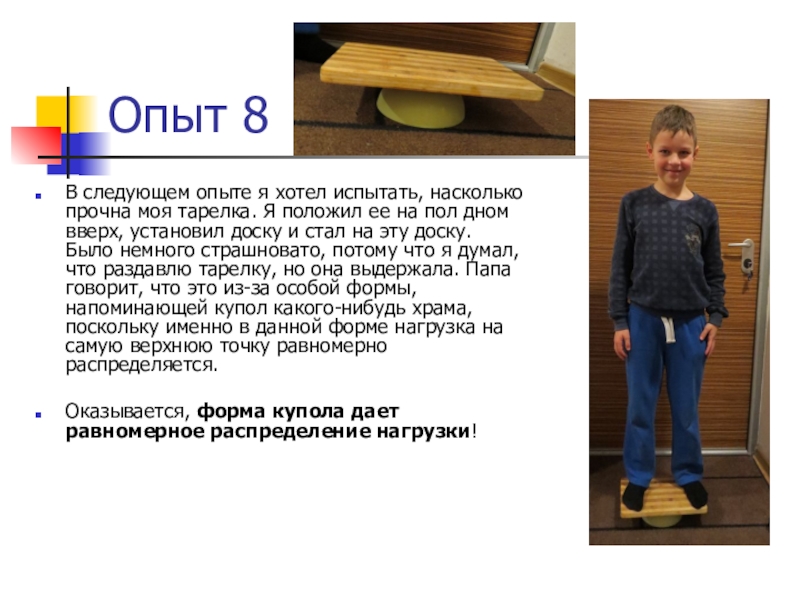 Я положил ее на пол дном вверх, установил доску и стал на эту доску. Было немного страшновато, потому что я думал, что раздавлю тарелку, но она выдержала. Папа говорит, что это из-за особой формы, напоминающей купол какого-нибудь храма, поскольку именно в данной форме нагрузка на самую верхнюю точку равномерно распределяется.