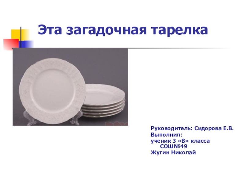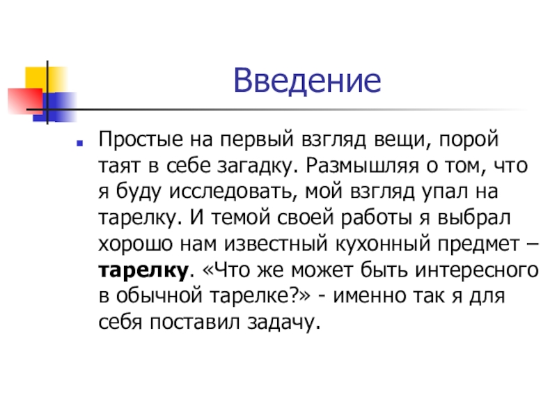 о том, что я буду исследовать, мой взгляд упал на тарелку. И темой своей работы я выбрал хорошо нам известный кухонный предмет – тарелку. «Что же может быть интересного в обычной тарелке?» - именно так я для себя поставил задачу.