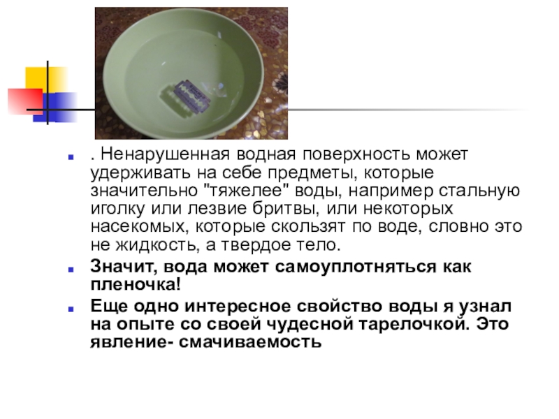Еще одно интересное свойство воды я узнал на опыте со своей чудесной тарелочкой. Это явление- смачиваемость