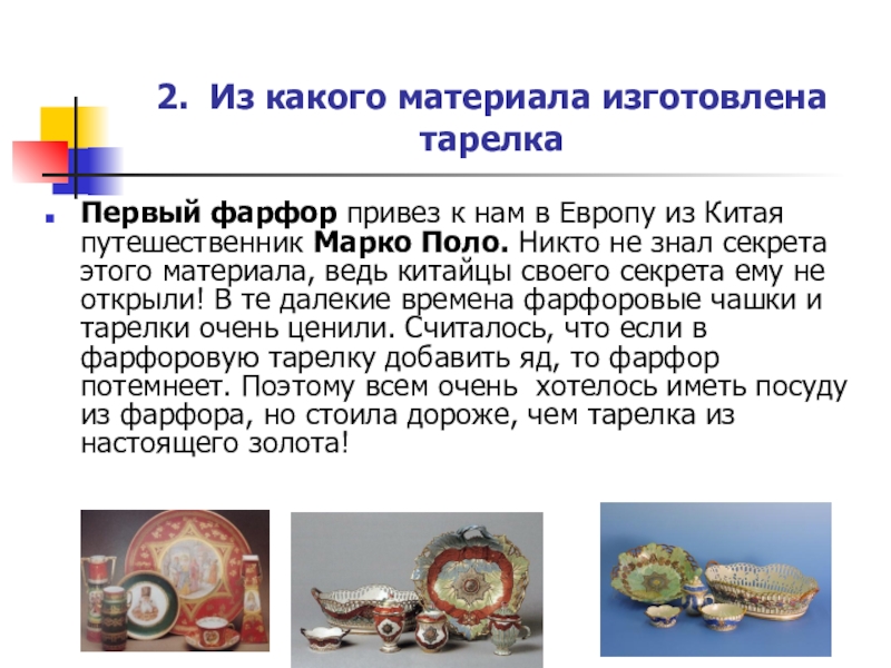 из Китая путешественник Марко Поло. Никто не знал секрета этого материала, ведь китайцы своего секрета ему не открыли! В те далекие времена фарфоровые чашки и тарелки очень ценили. Считалось, что если в фарфоровую тарелку добавить яд, то фарфор потемнеет. Поэтому всем очень хотелось иметь посуду из фарфора, но стоила дороже, чем тарелка из настоящего золота!