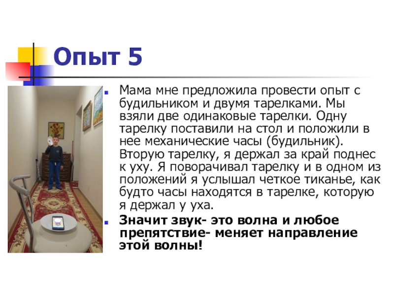 Мама мне предложила провести опыт с будильником и двумя