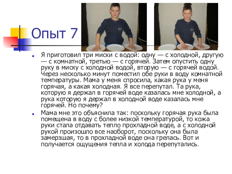 другую — с комнатной, третью — с горячей. Затем опустить одну руку в миску с холодной водой, вторую — с горячей водой. Через несколько минут поместил обе руки в воду комнатной температуры. Мама у меня спросила, какая рука у меня горячая, а какая холодная. Я все перепутал. Та рука, которую я держал в горячей воде казалась мне холодной, а рука которую я держал в холодной воде казалась мне горячей. Но почему?