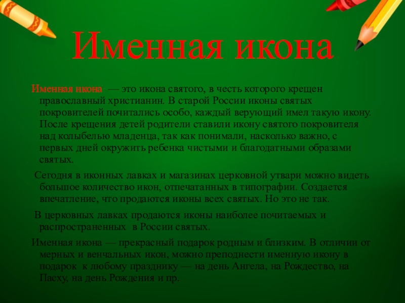 православный христианин. В старой России иконы святых покровителей почитались особо, каждый верующий имел такую икону. После крещения детей родители ставили икону святого покровителя над колыбелью младенца, так как понимали, насколько важно, с первых дней окружить ребенка чистыми и благодатными образами святых.