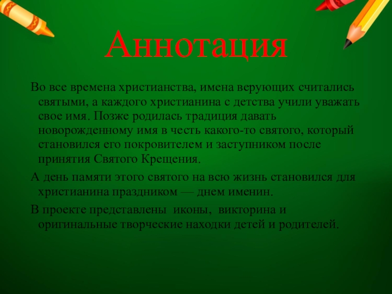В проекте представлены иконы, викторина и оригинальные творческие находки детей и родителей.