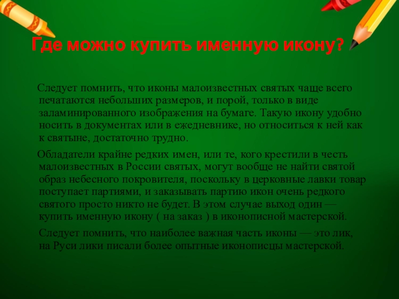 Обладатели крайне редких имен, или те, кого крестили в честь малоизвестных в России святых, могут вообще не найти святой образ небесного покровителя, поскольку в церковные лавки товар поступает партиями, и заказывать партию икон очень редкого святого просто никто не будет. В этом случае выход один —купить именную икону ( на заказ ) в иконописной мастерской.
