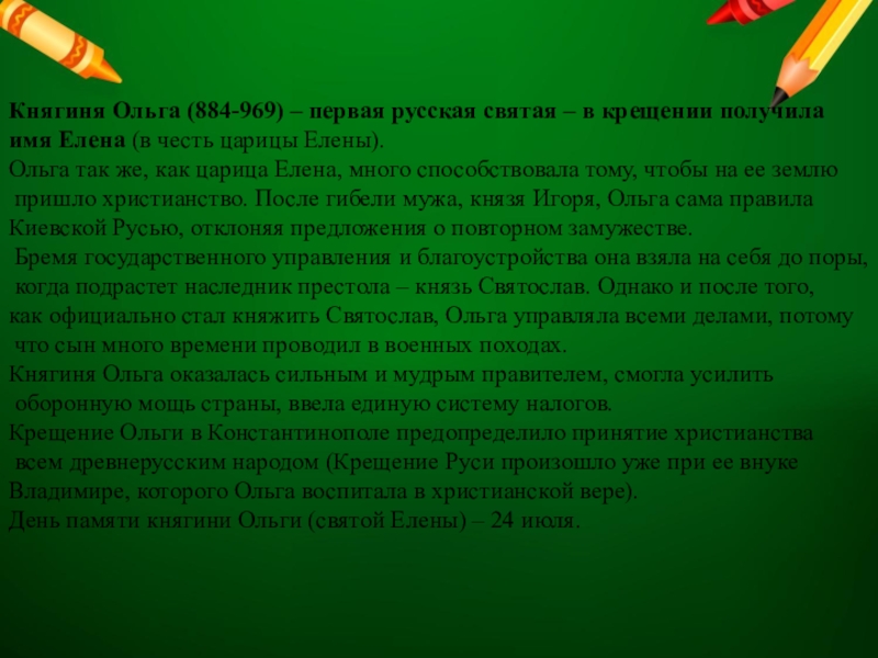 День памяти княгини Ольги (святой Елены) – 24 июля.
