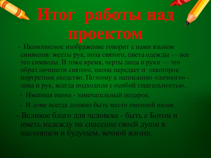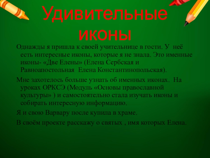 Мне захотелось больше узнать об именных иконах. На уроках ОРКСЭ (Модуль «Основы православной культуры» ) и самостоятельно стала изучать иконы и собирать интересную информацию.