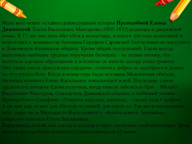 Мантурова (1805-1832) родилась в дворянской семье. В 17 лет она дала обет уйти в монастырь, а спустя три года испытаний и подготовки к монашеству батюшка Серафим Саровский благословил ее поступить в Дивеевскую Казанскую общину. Кроме общих послушаний, Елена всегда выполняла наиболее трудные поручения батюшки – не только потому, что получила хорошее образование и в отличие от многих сестер знала грамоту.