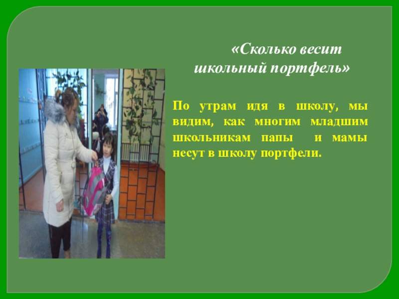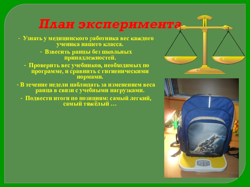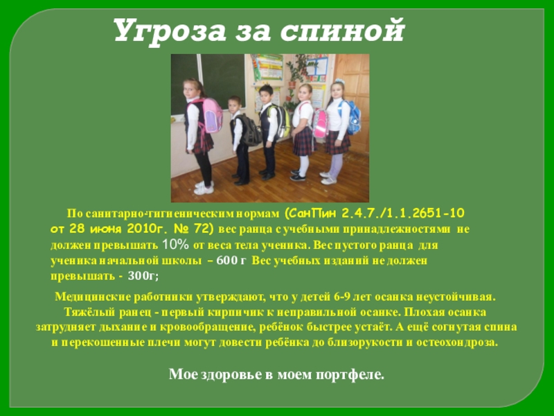 2. Узнать какие гигиенические требования предъявляются к школьному портфелю, и как тяжелый ранец влияет на здоровье ребенка.