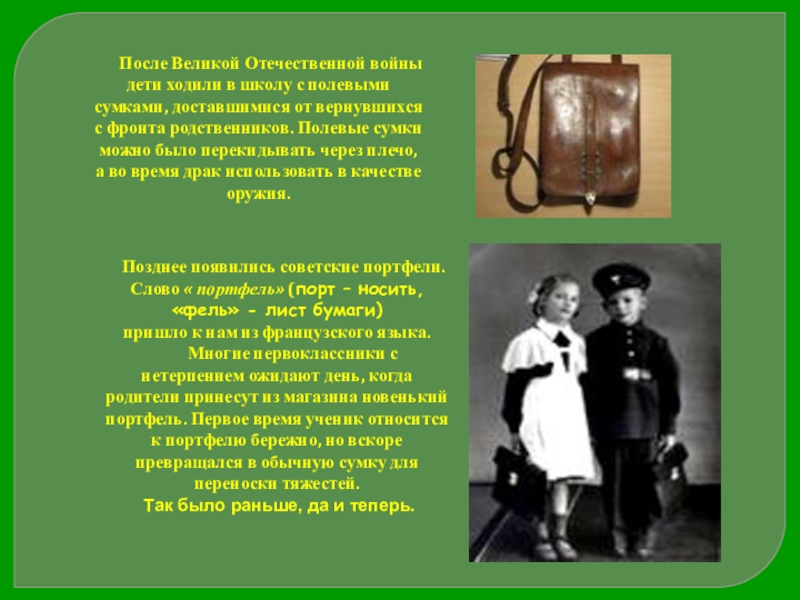 Позднее появились советские портфели. Слово « портфель» (порт – носить,«фель» - лист бумаги)
