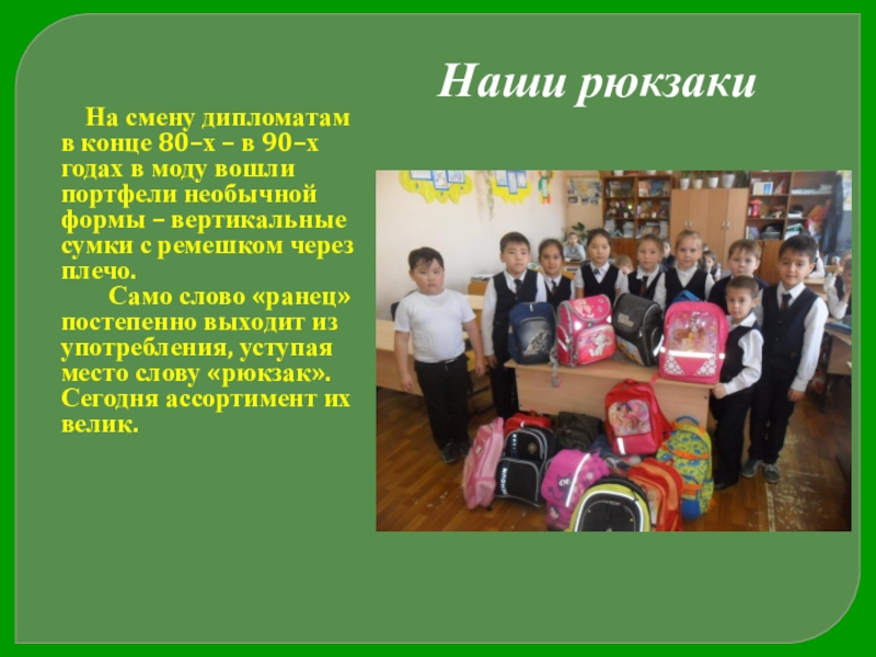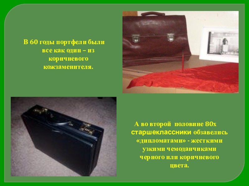 А во второй половине 80х старшеклассники обзавелись «дипломатами» - жесткими узкими чемоданчиками черного или коричневого цвета.