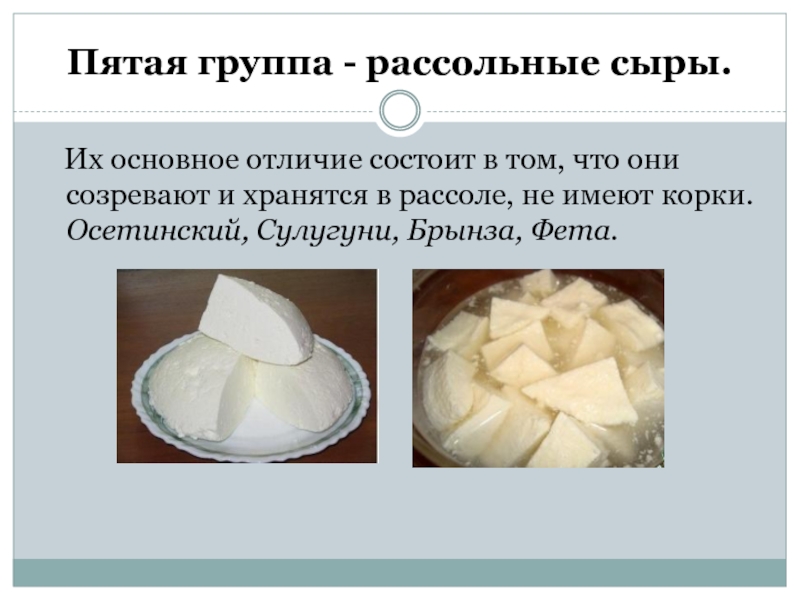 в том, что они созревают и хранятся в рассоле, не имеют корки. Осетинский, Сулугуни, Брынза, Фета.