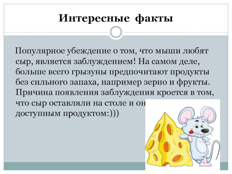 является заблуждением! На самом деле, больше всего грызуны предпочитают продукты без сильного запаха, например зерно и фрукты. Причина появления заблуждения кроется в том, что сыр оставляли на столе и он был более доступным продуктом:)))