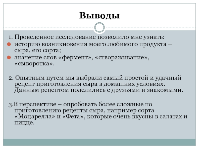 3.В перспективе – опробовать более сложные по приготовлению рецепты сыра, например сорта «Моцарелла» и «Фета», которые очень вкусны в салатах и пицце.