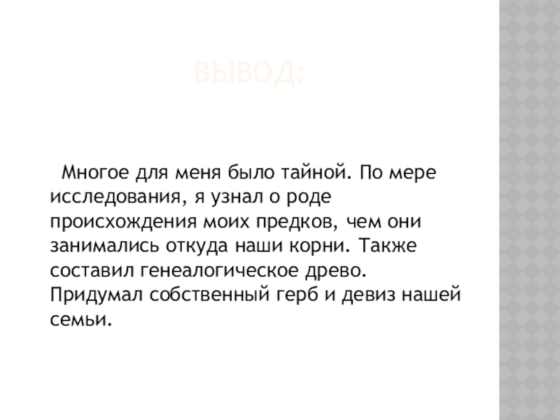 роде происхождения моих предков, чем они занимались откуда наши корни. Также составил генеалогическое древо. Придумал собственный герб и девиз нашей семьи.