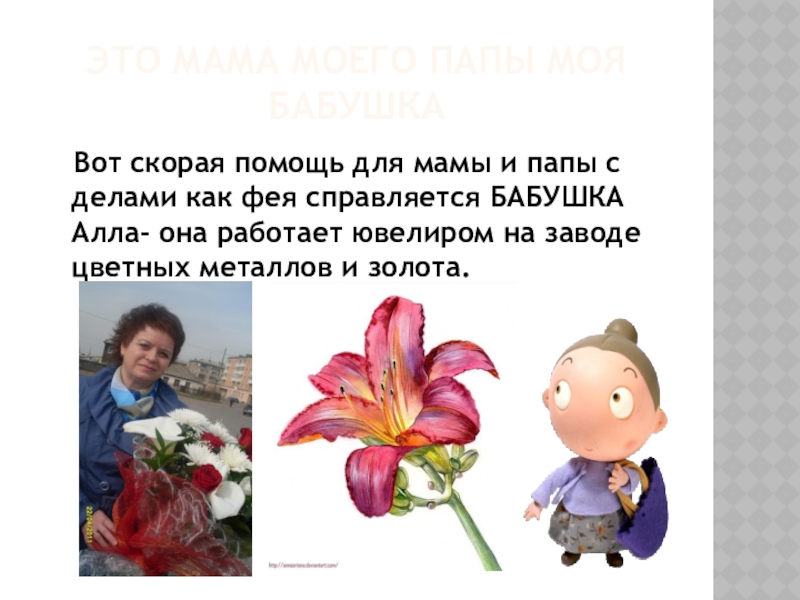 мамы и папы с делами как фея справляется БАБУШКА Алла- она работает ювелиром на заводе цветных металлов и золота.