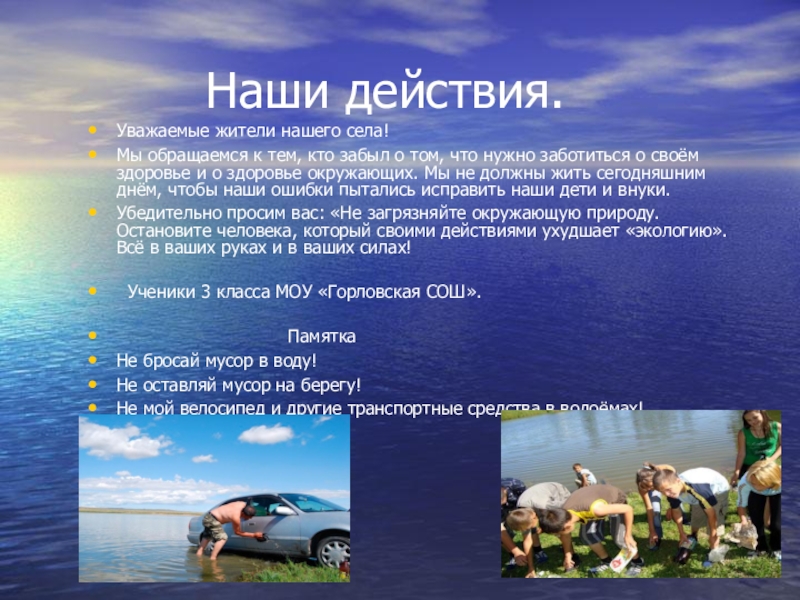 Свой вклад может внести каждый, от Президента до первоклассника. Для этого надо просто бережно относиться к воде, не загрязнять водоемы и территорию вокруг них, принимать активное участие в экологических мероприятиях. Надо знать особенности воды в своем родном крае и понимать, что наши реки, озера и родники - это единая система. Если каждый гражданин страны будет заботиться о чистоте воды, то на всей Земле чистой воды станет больше.