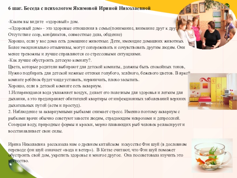 Ирина Николаевна рассказала нам о древнем китайском искусстве Фэн шуй (в дословном переводе фэн шуй означает «вода и ветер»). В Китае считают, что Фэн шуй поможет обустроить свой дом, укрепить здоровье и многое другое. Она посоветовала изучить это искусство.