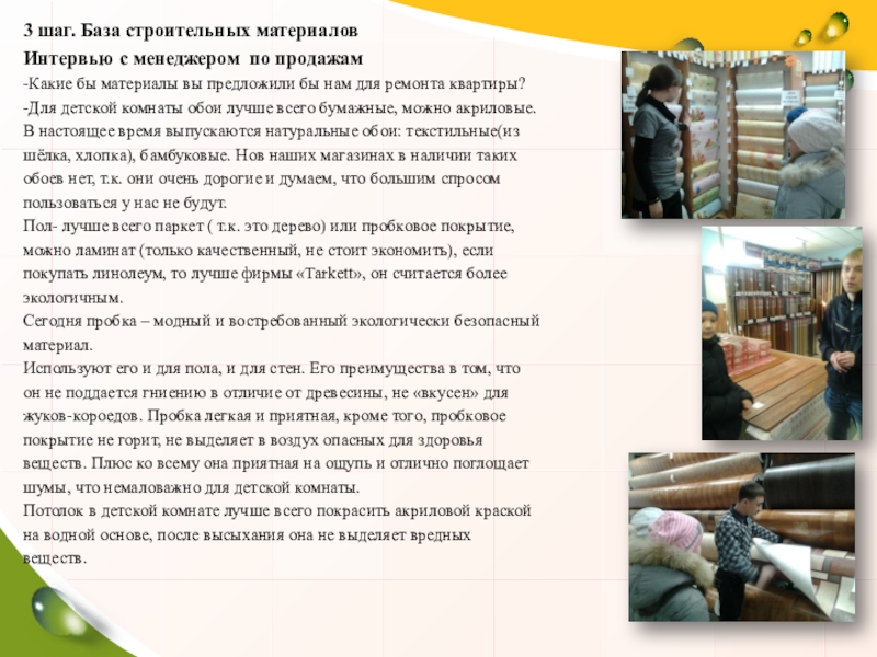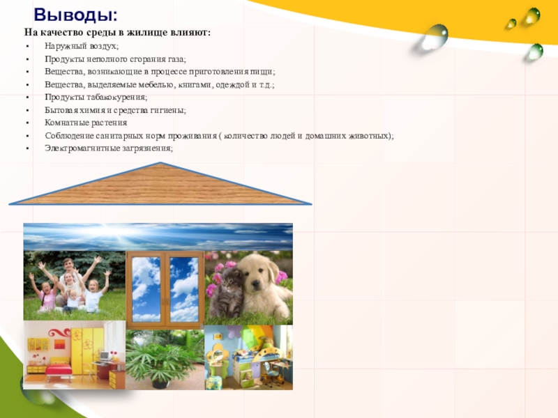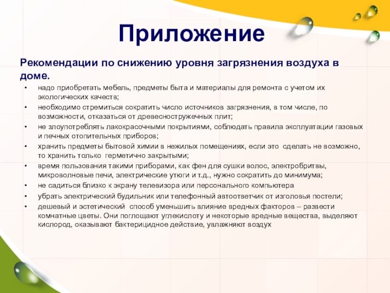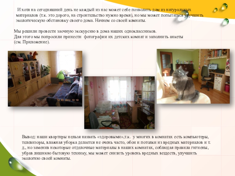 Вывод: наши квартиры нельзя назвать «здоровыми»,т.к. у многих в комнатах есть компьютеры, телевизоры, влажная уборка делается не очень часто, обои и потолки из вредных материалов и т. д., но заменив некоторые отделочные материалы в наших комнатах, соблюдая правила гигиены, убрав лишнюю бытовую технику, мы может снизить уровень вредных веществ, улучшить экологию своей комнаты.