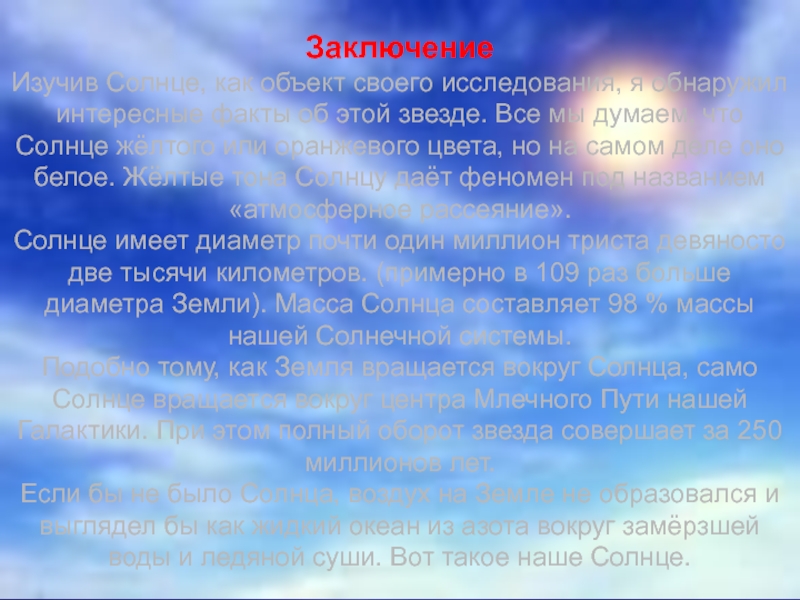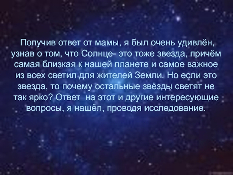 том, что Солнце- это тоже звезда, причём самая близкая к нашей планете и самое важное из всех светил для жителей Земли. Но если это звезда, то почему остальные звёзды светят не так ярко? Ответ на этот и другие интересующие вопросы, я нашёл, проводя исследование.