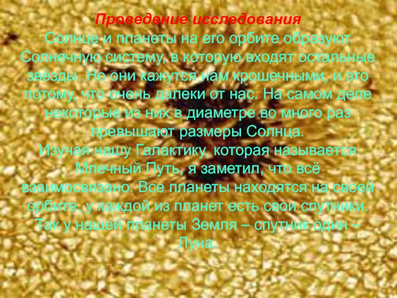 Изучая нашу Галактику, которая называется Млечный Путь, я заметил, что всё взаимосвязано. Все планеты находятся на своей орбите, у каждой из планет есть свои спутники. Так у нашей планеты Земля – спутник один – Луна.